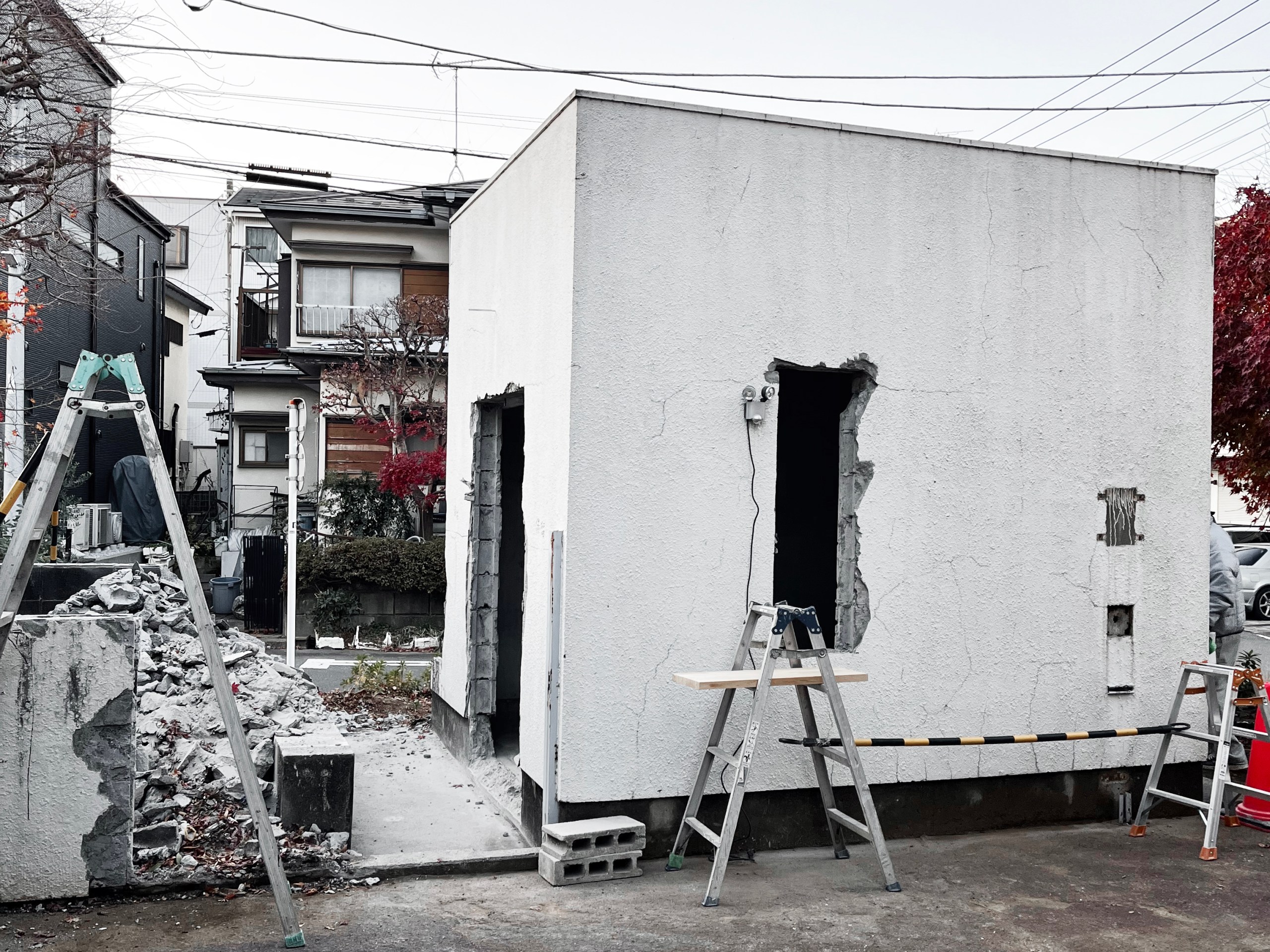 集合住宅の敷地内に建つコンクリートブロック造の建屋をコーヒースタンドに改修するプロジェクト。