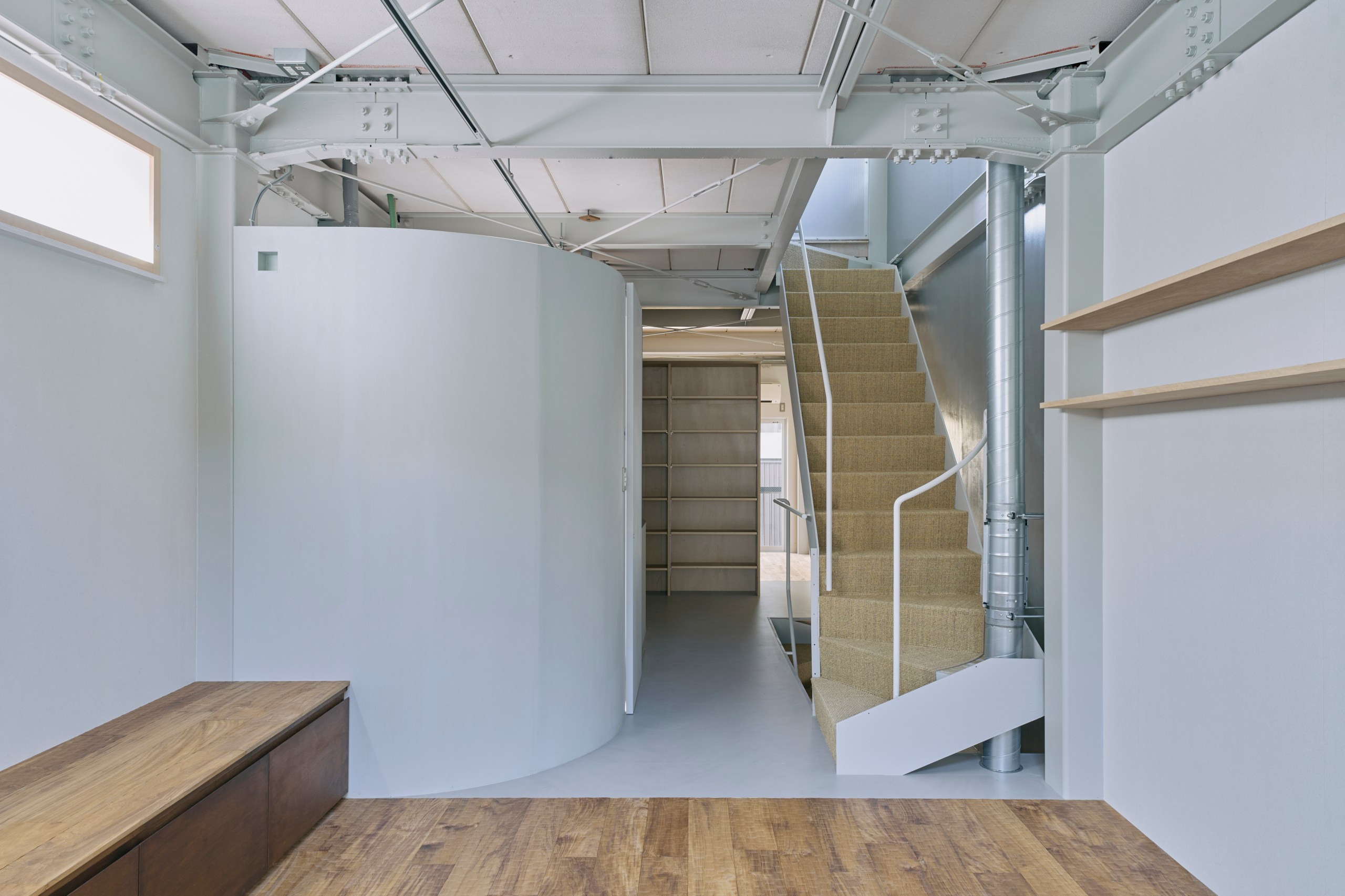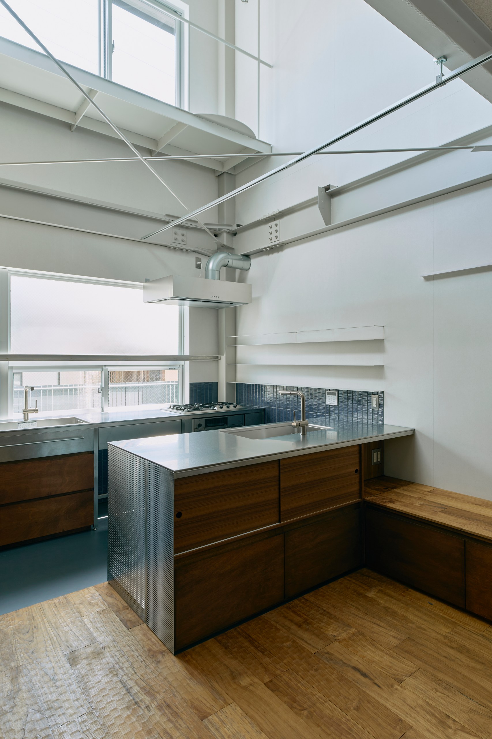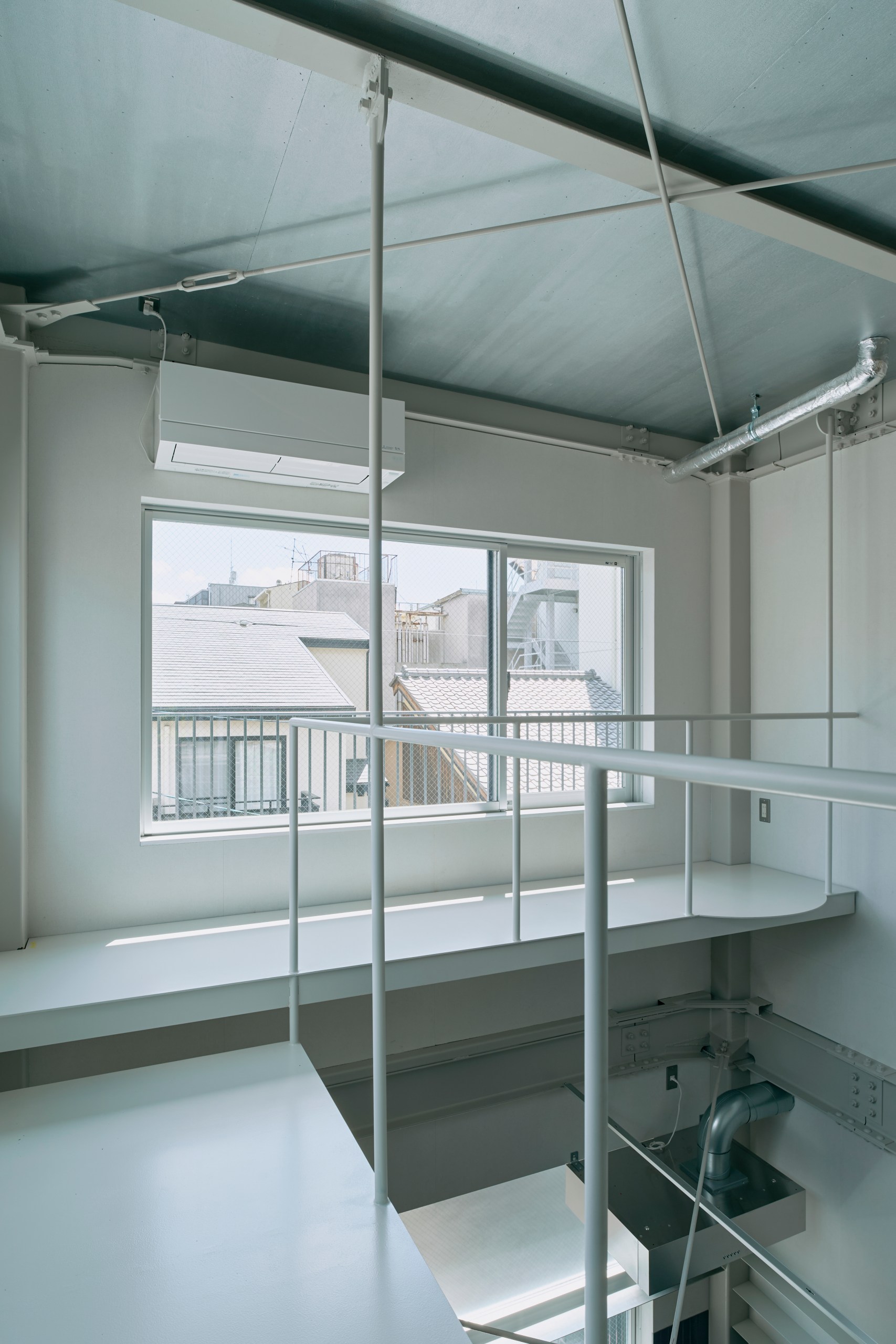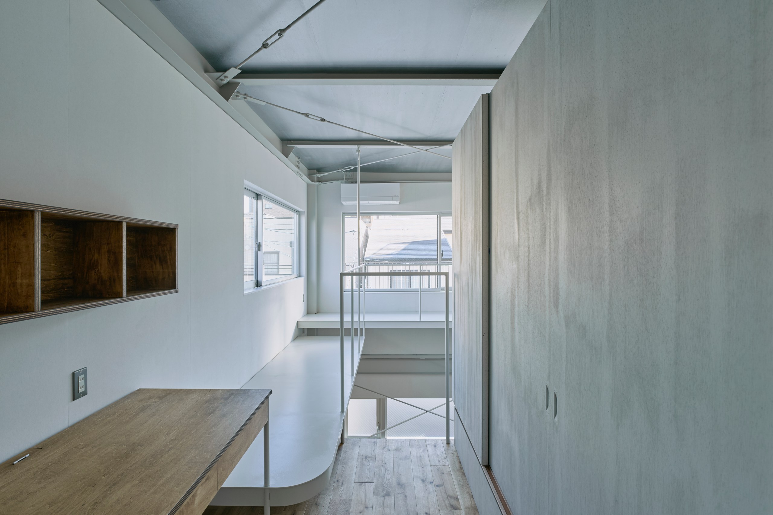 2階LDKは吹き抜けとし、3階の寝室との立体的なつながりを生み出した。屋根の梁から吊り下げた通路は、開口部のメンテナンスと消防用代替進入口の動線であるが、軽快なディテールとすることで、南道路側の採光を奥まで届けるライトシェルフの機能も持たせた。既存の鉄骨小梁やブレースのディテールや寸法を踏襲し、ガセットプレートを介した納まりとして、主構造との分節、既存建物との調和を図っている。