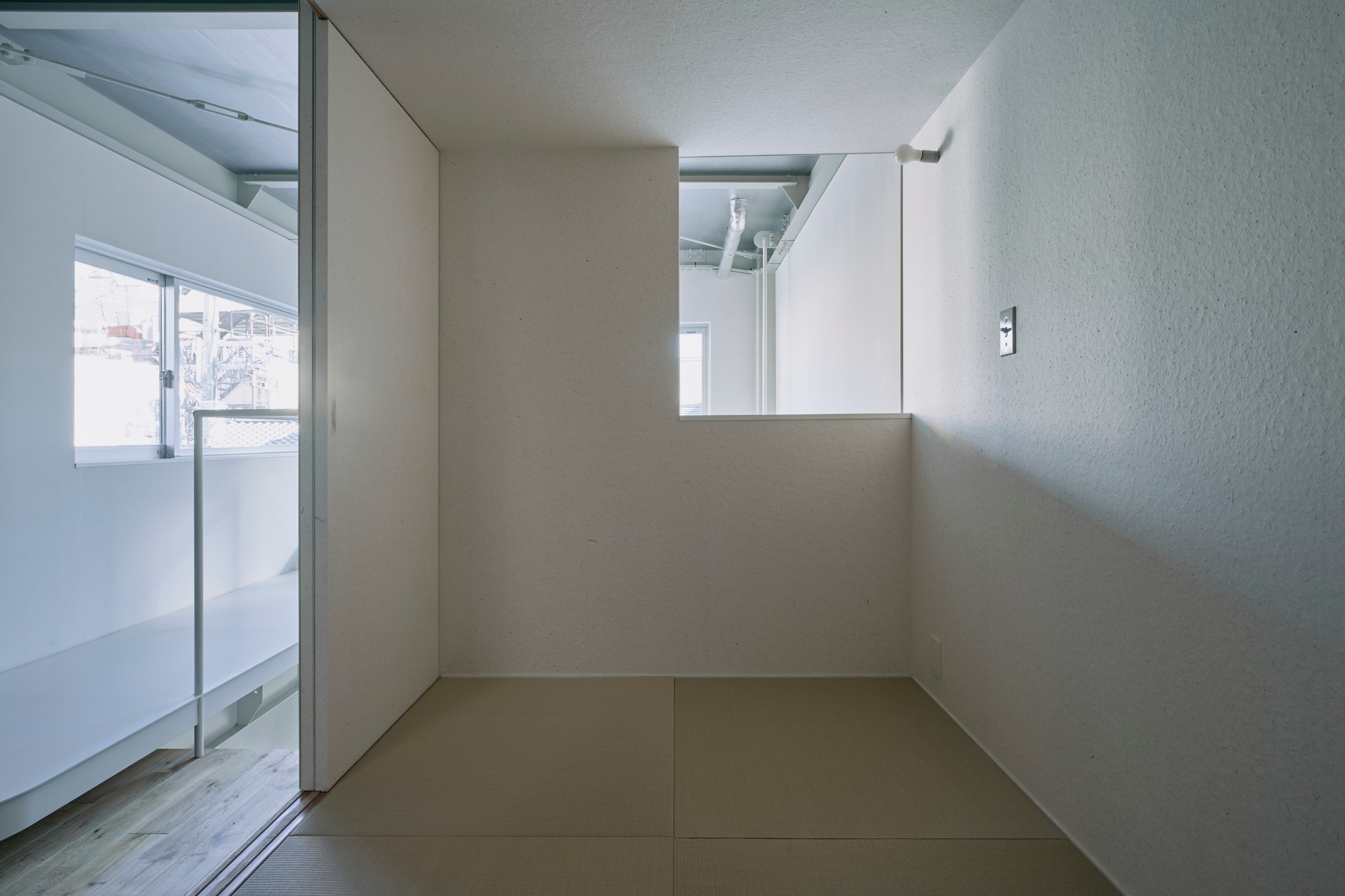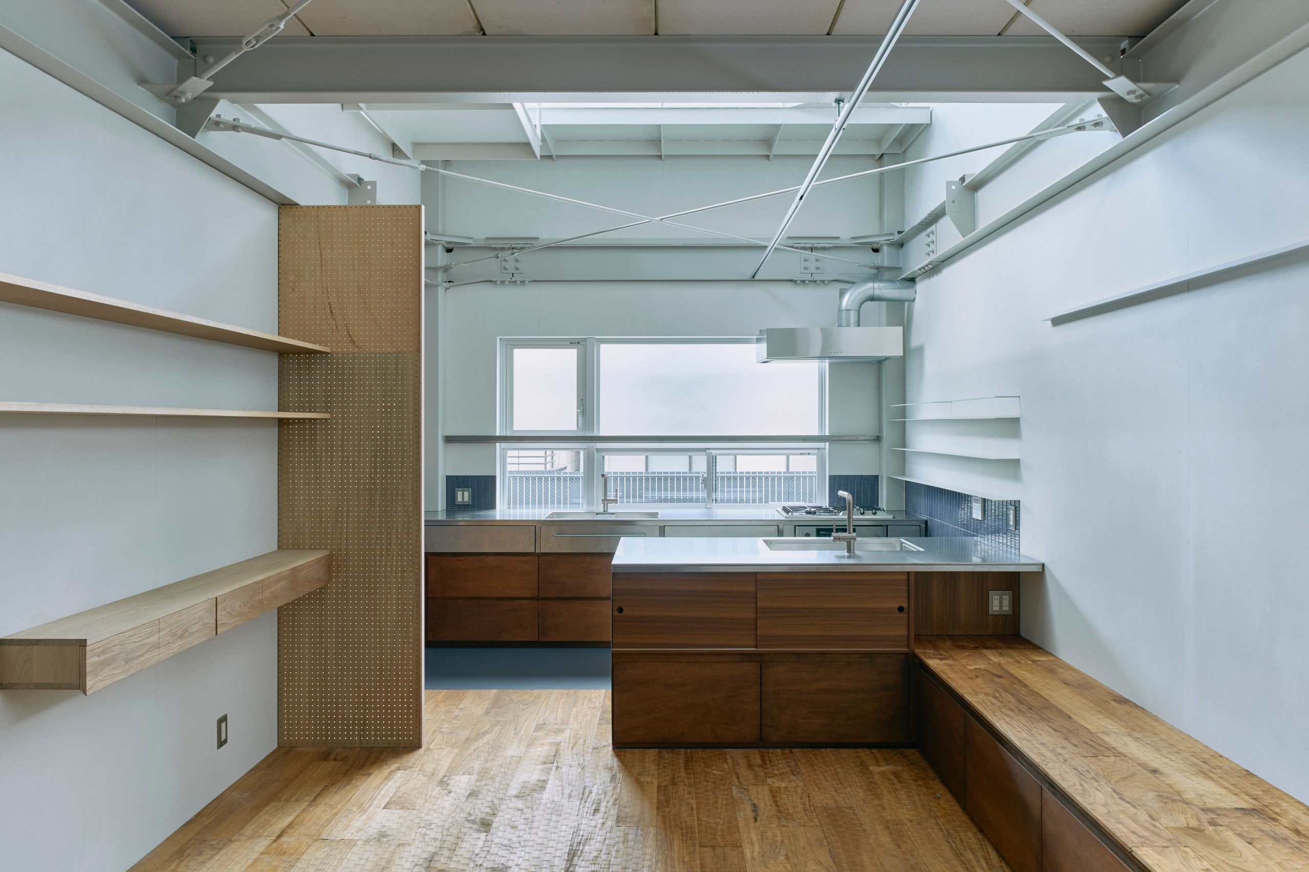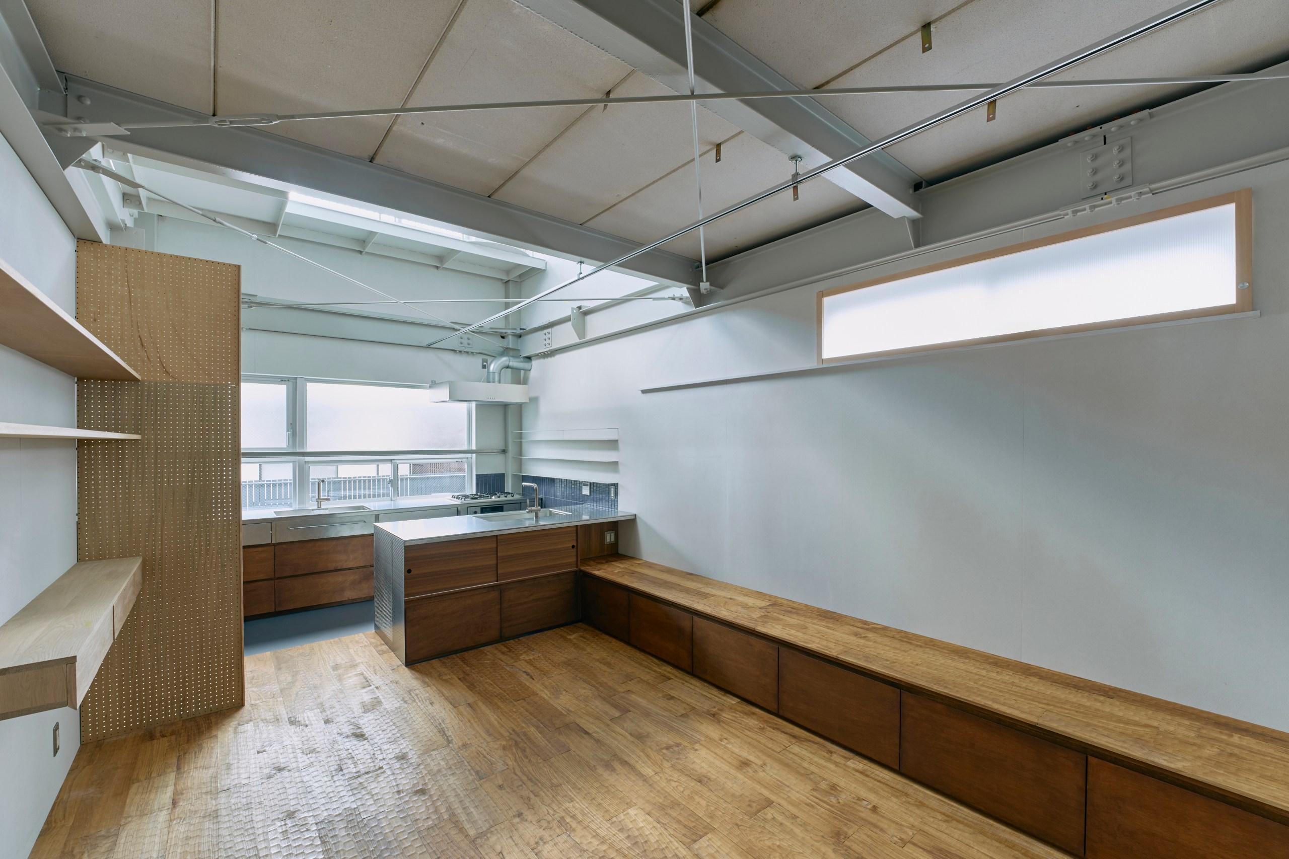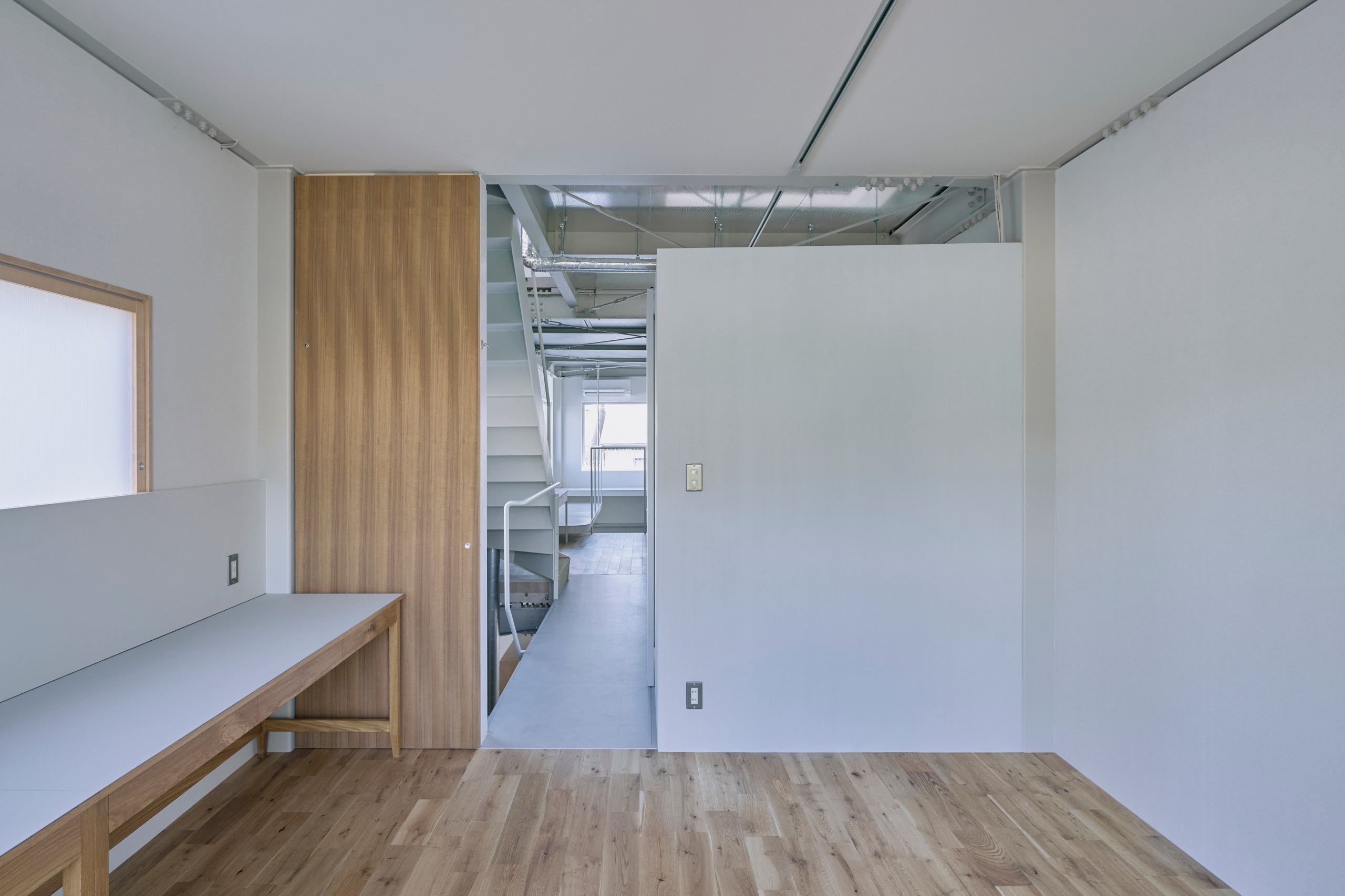 2階LDKは吹き抜けとし、3階の寝室との立体的なつながりを生み出した。屋根の梁から吊り下げた通路は、開口部のメンテナンスと消防用代替進入口の動線であるが、軽快なディテールとすることで、南道路側の採光を奥まで届けるライトシェルフの機能も持たせた。既存の鉄骨小梁やブレースのディテールや寸法を踏襲し、ガセットプレートを介した納まりとして、主構造との分節、既存建物との調和を図っている。