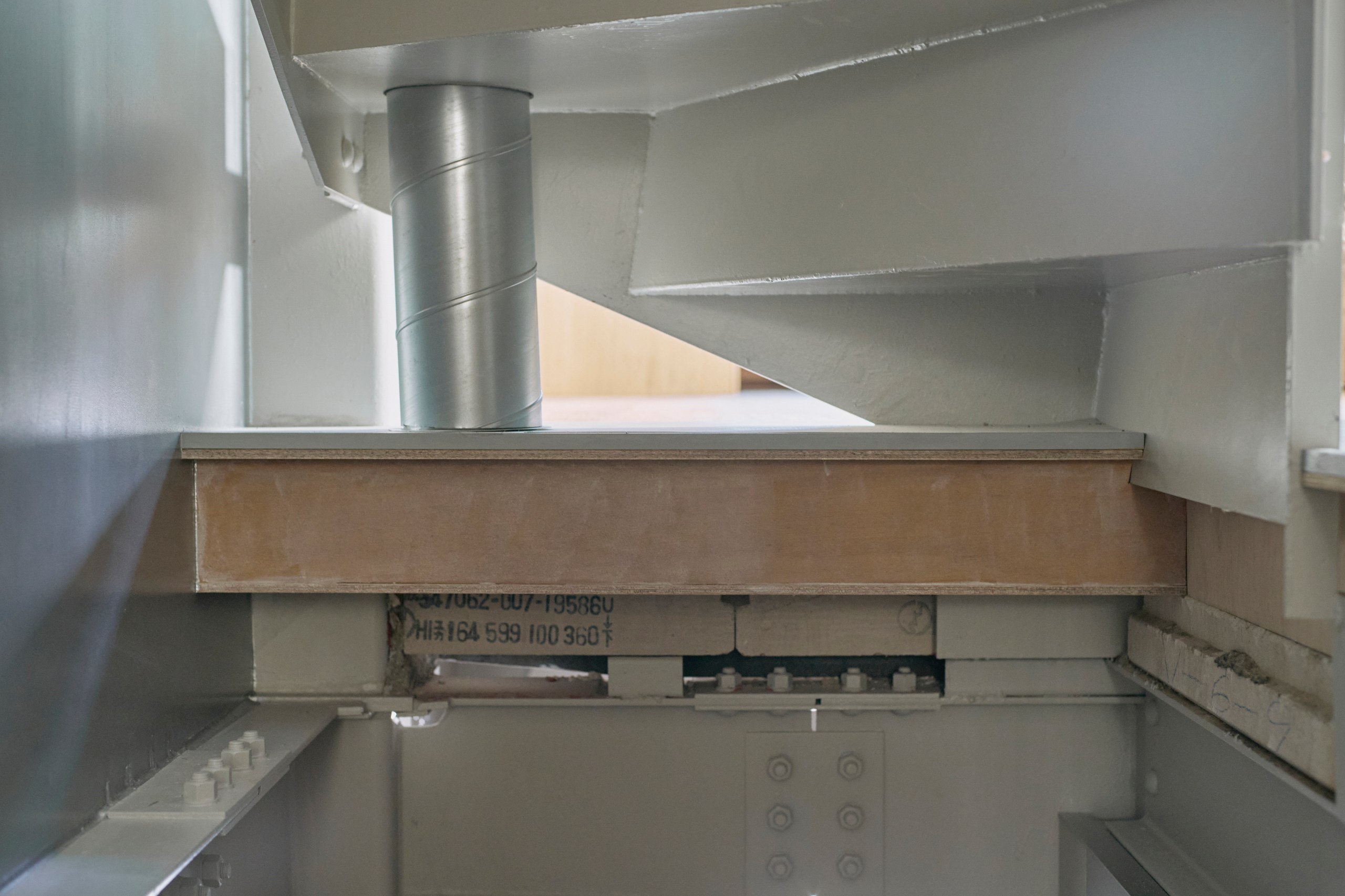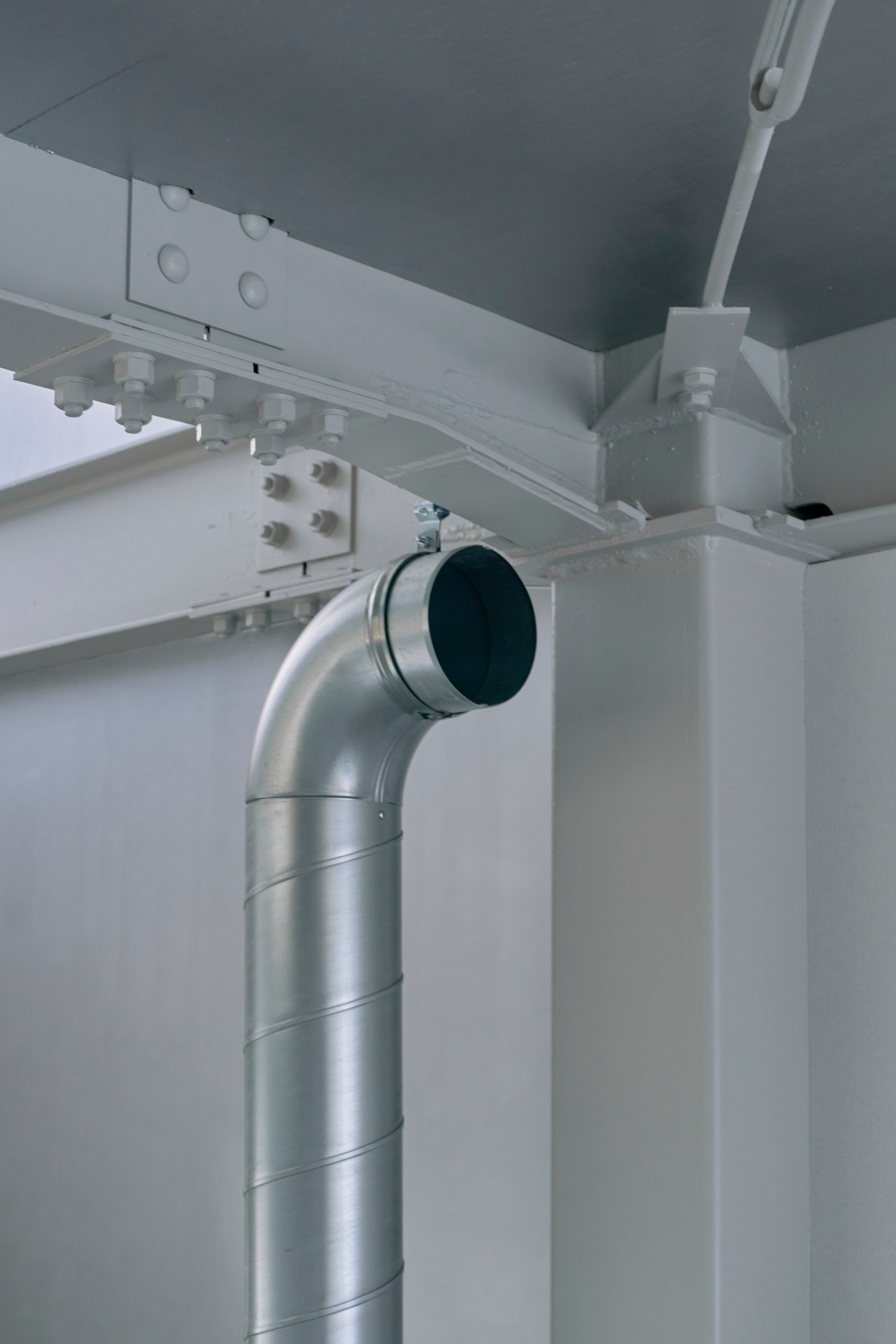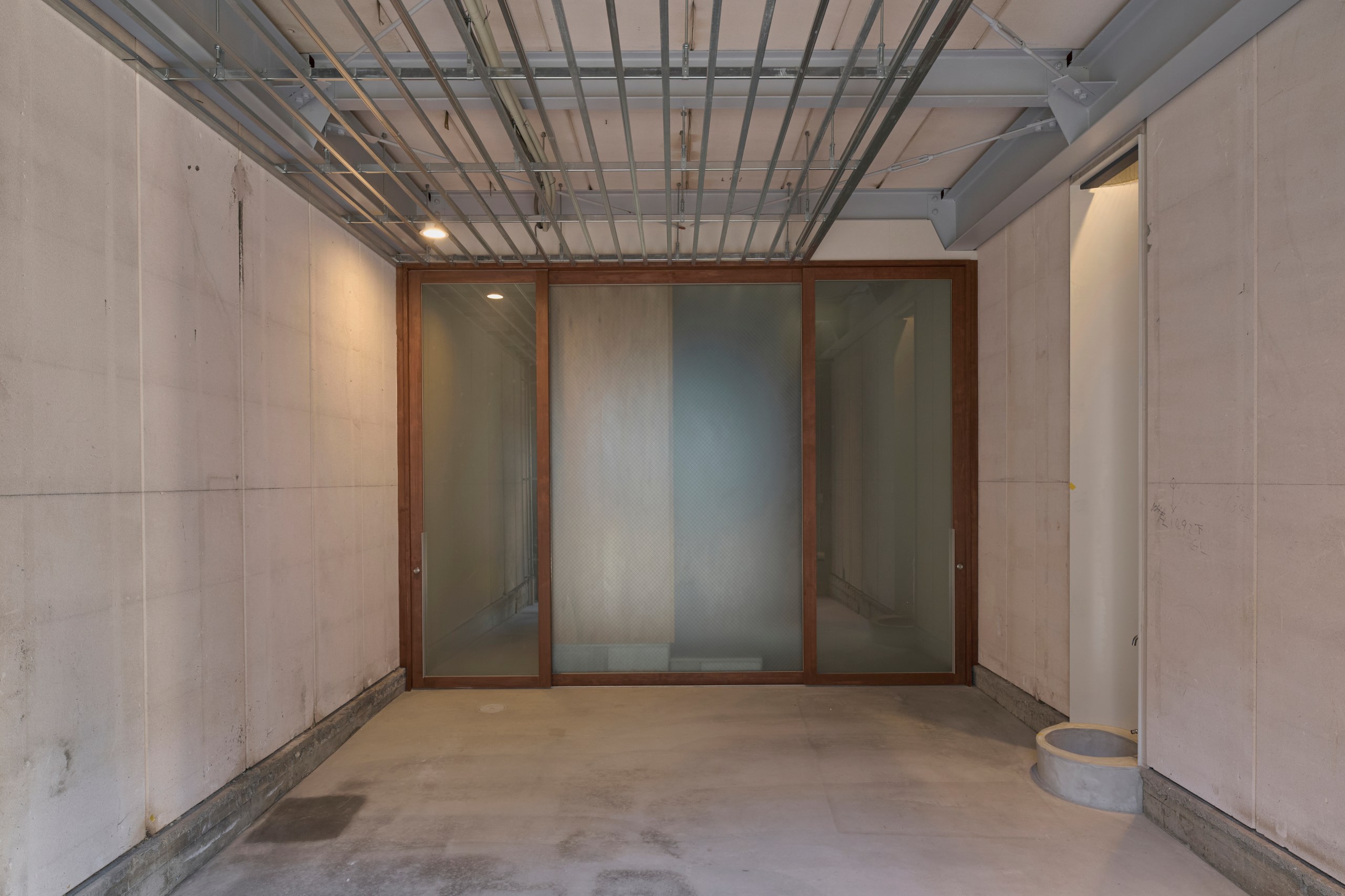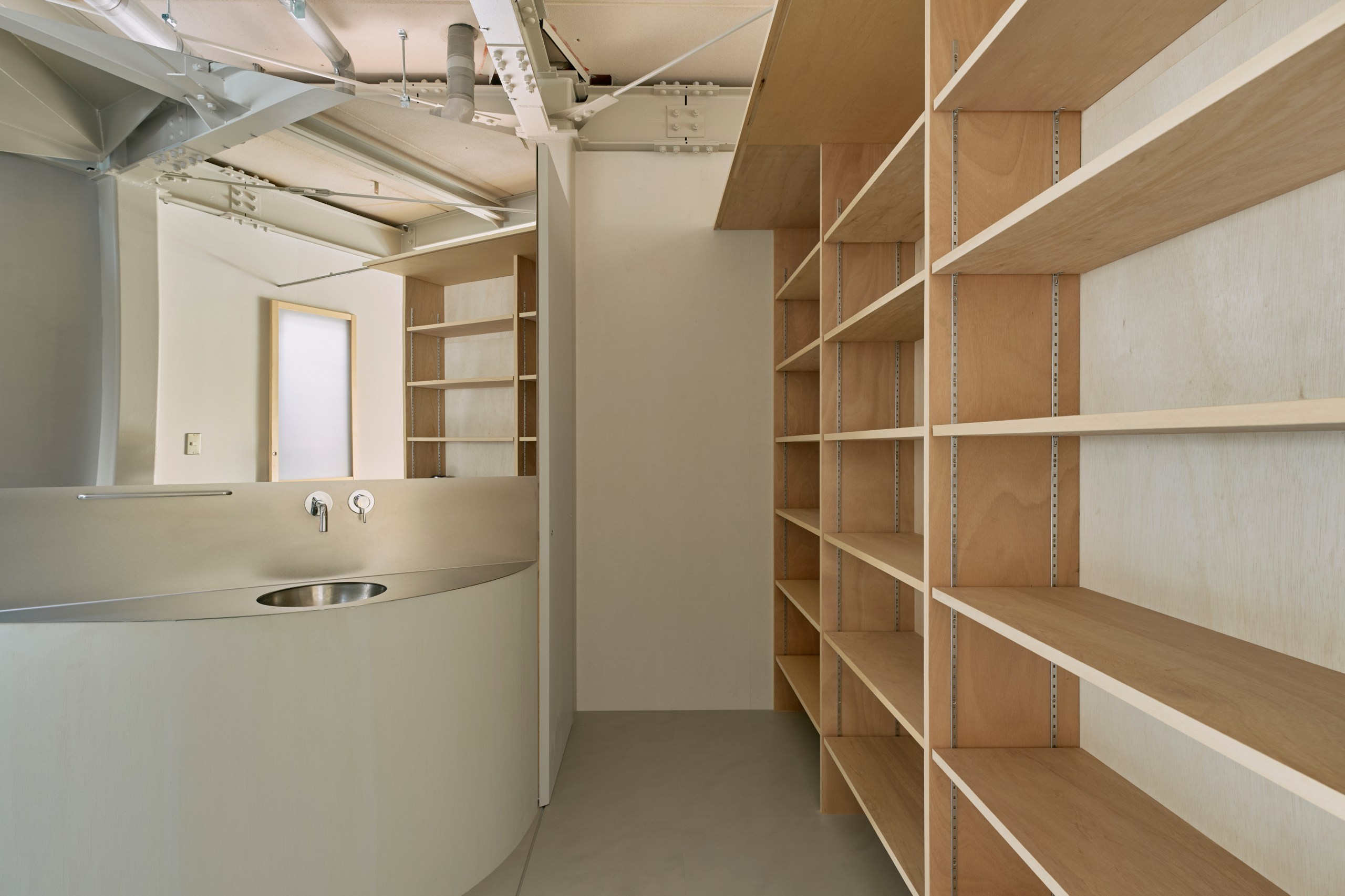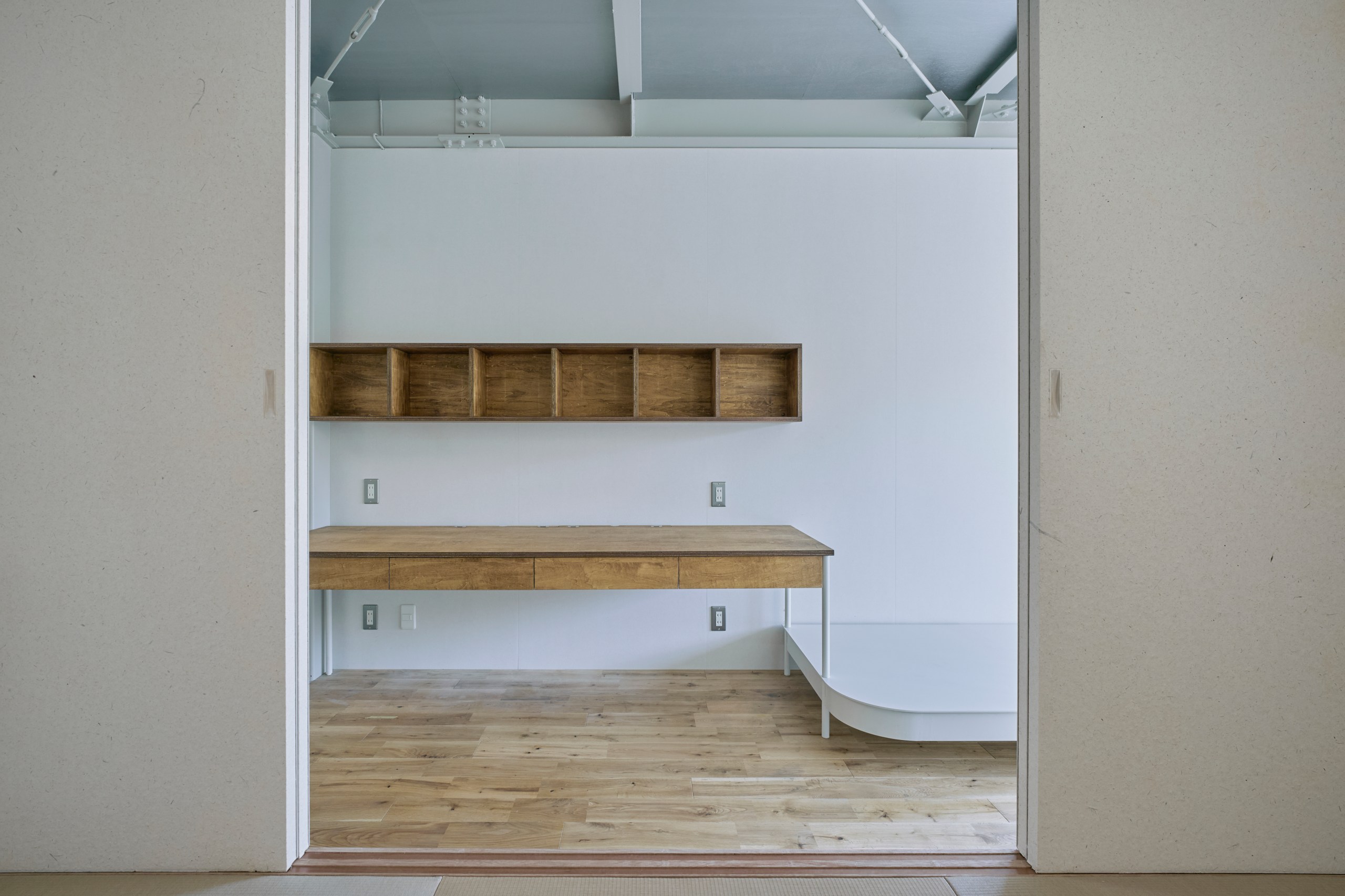 2階LDKは吹き抜けとし、3階の寝室との立体的なつながりを生み出した。屋根の梁から吊り下げた通路は、開口部のメンテナンスと消防用代替進入口の動線であるが、軽快なディテールとすることで、南道路側の採光を奥まで届けるライトシェルフの機能も持たせた。既存の鉄骨小梁やブレースのディテールや寸法を踏襲し、ガセットプレートを介した納まりとして、主構造との分節、既存建物との調和を図っている。