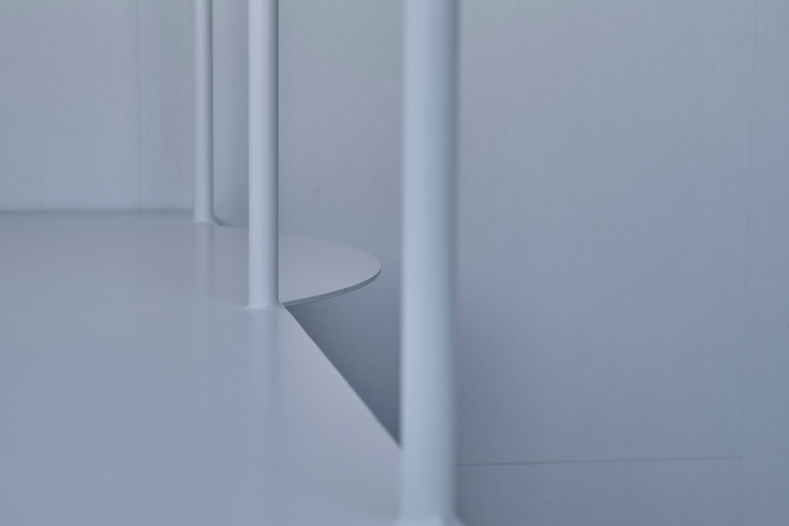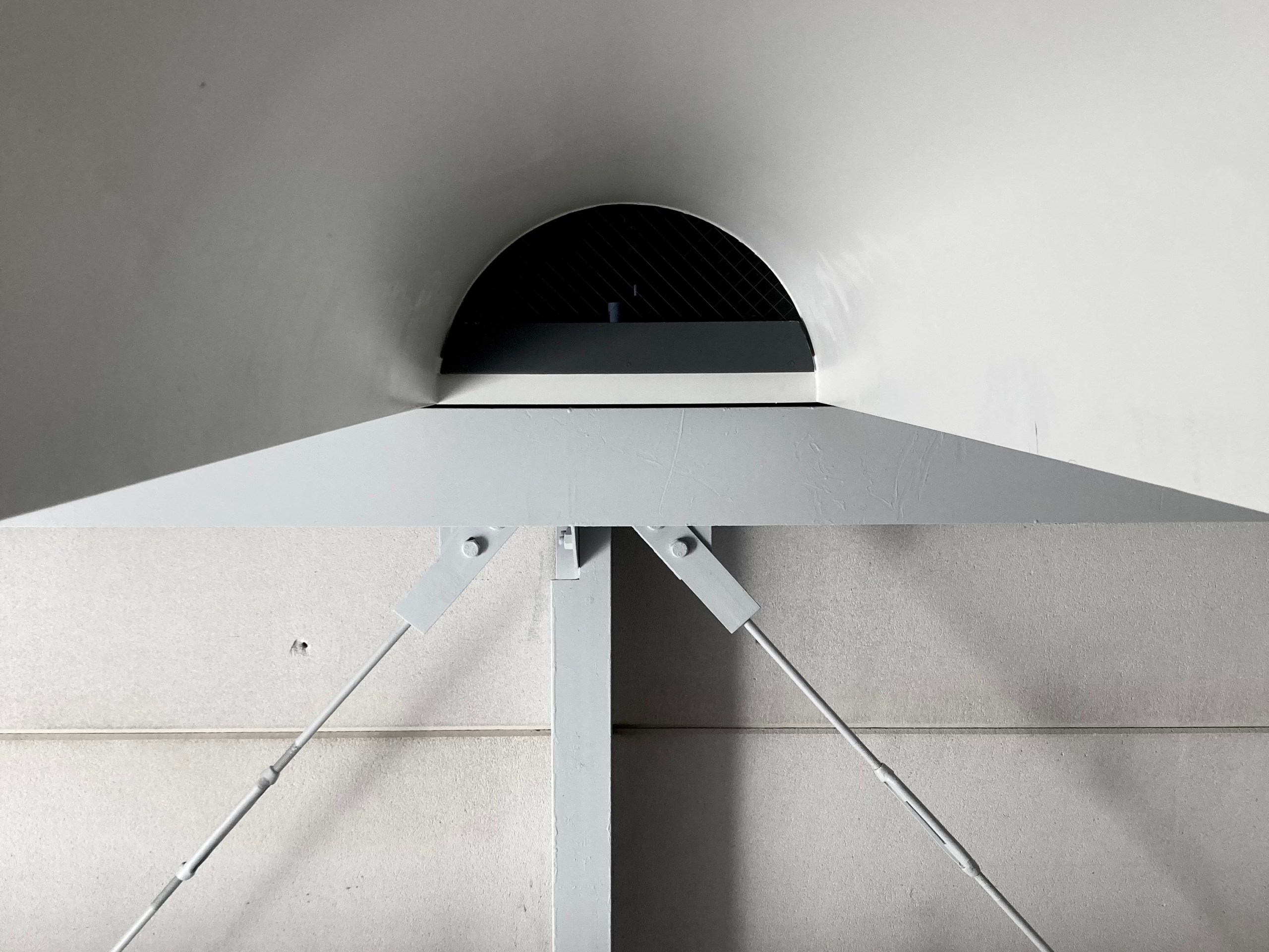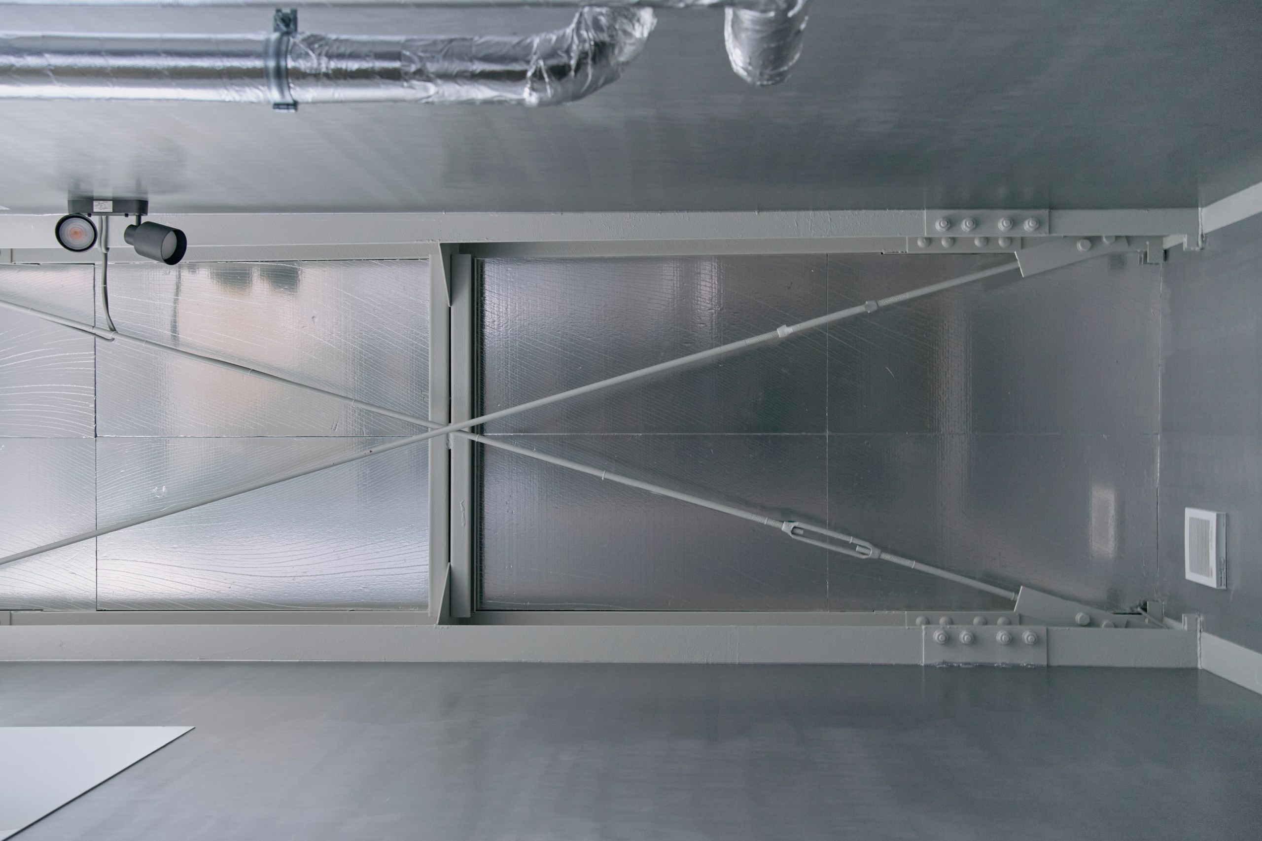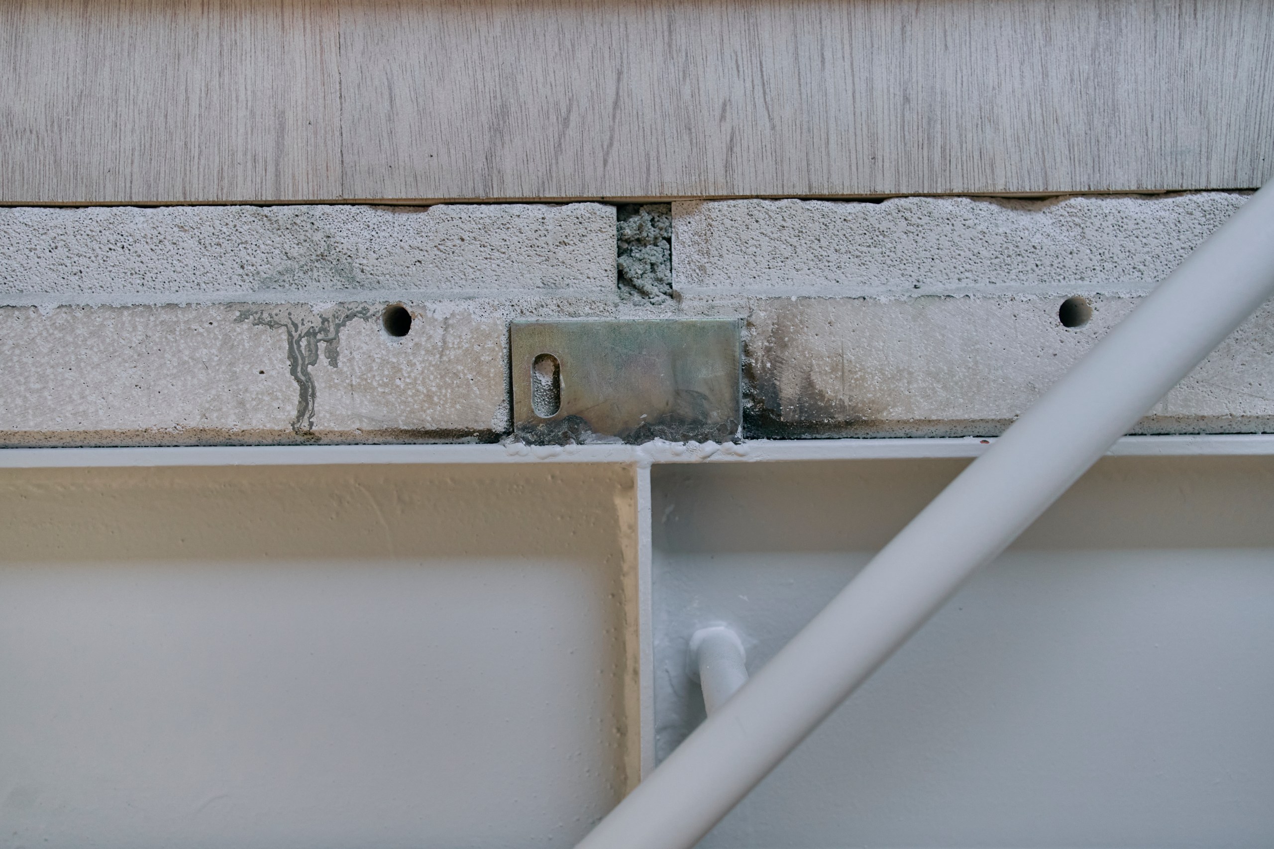 2階LDKは吹き抜けとし、3階の寝室との立体的なつながりを生み出した。屋根の梁から吊り下げた通路は、開口部のメンテナンスと消防用代替進入口の動線であるが、軽快なディテールとすることで、南道路側の採光を奥まで届けるライトシェルフの機能も持たせた。既存の鉄骨小梁やブレースのディテールや寸法を踏襲し、ガセットプレートを介した納まりとして、主構造との分節、既存建物との調和を図っている。