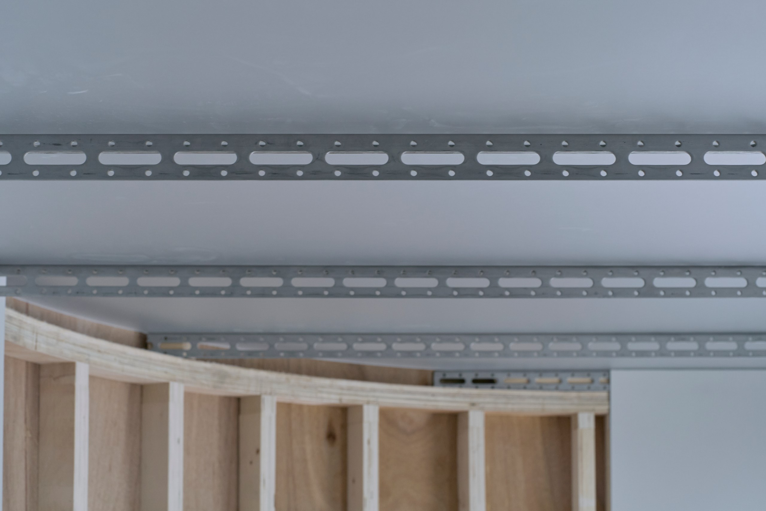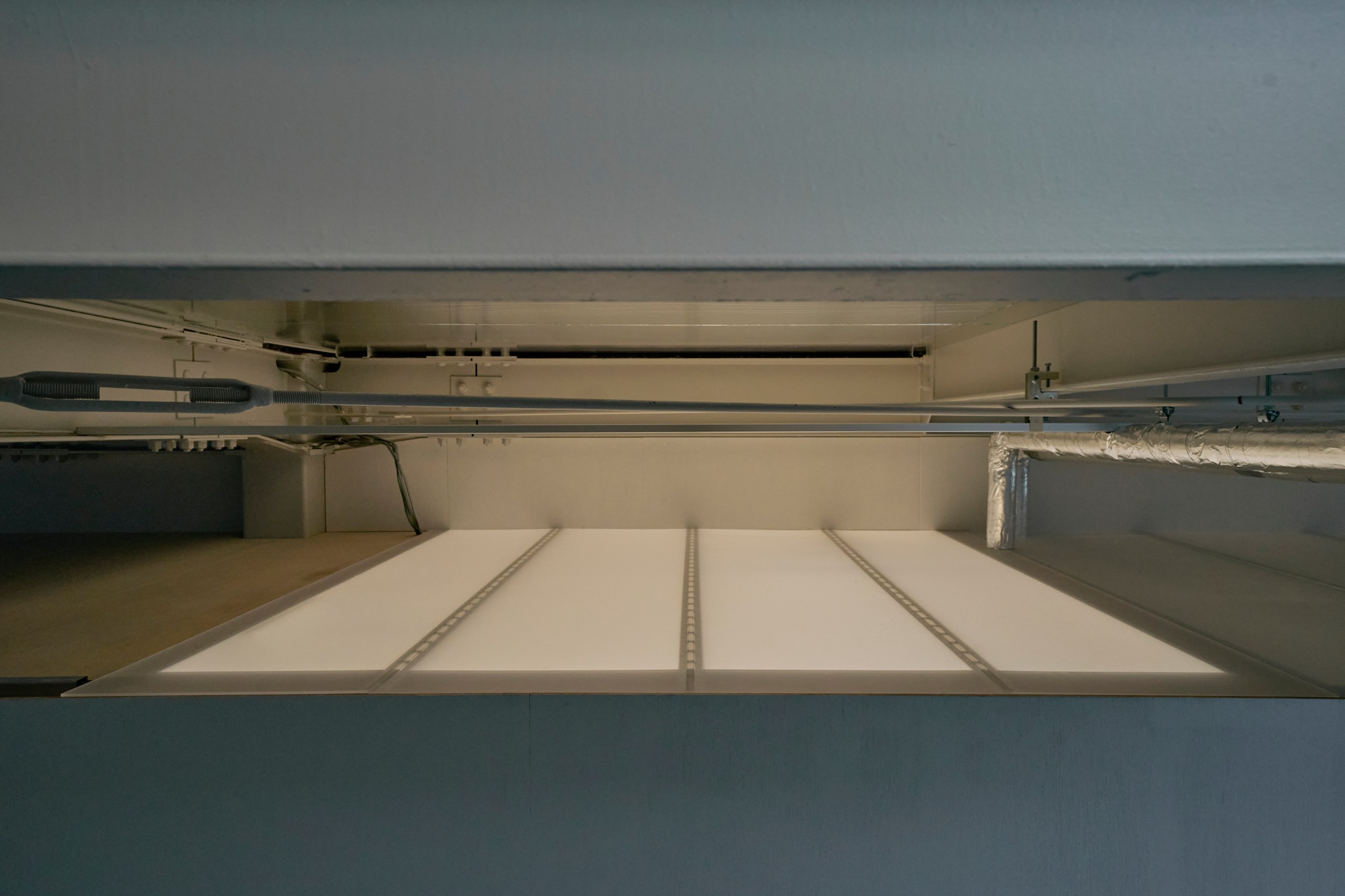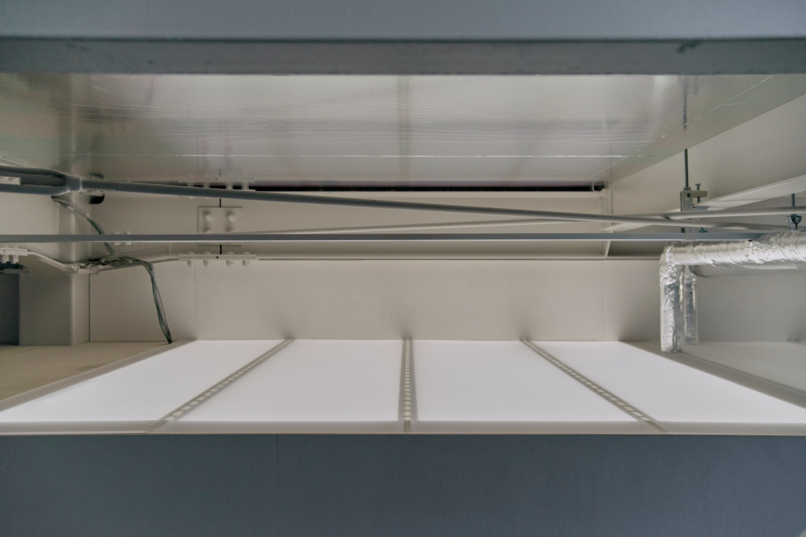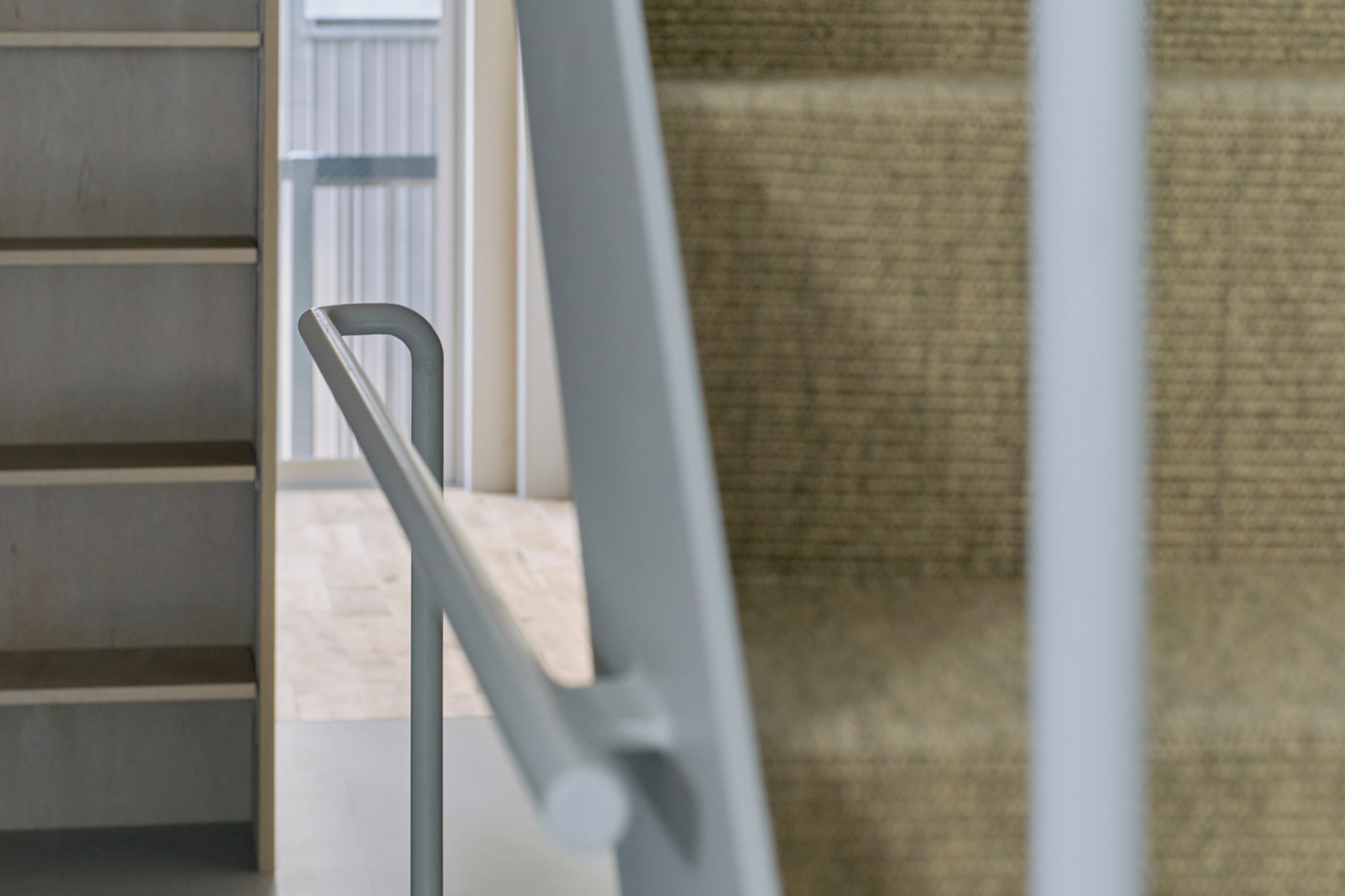 2階LDKは吹き抜けとし、3階の寝室との立体的なつながりを生み出した。屋根の梁から吊り下げた通路は、開口部のメンテナンスと消防用代替進入口の動線であるが、軽快なディテールとすることで、南道路側の採光を奥まで届けるライトシェルフの機能も持たせた。既存の鉄骨小梁やブレースのディテールや寸法を踏襲し、ガセットプレートを介した納まりとして、主構造との分節、既存建物との調和を図っている。