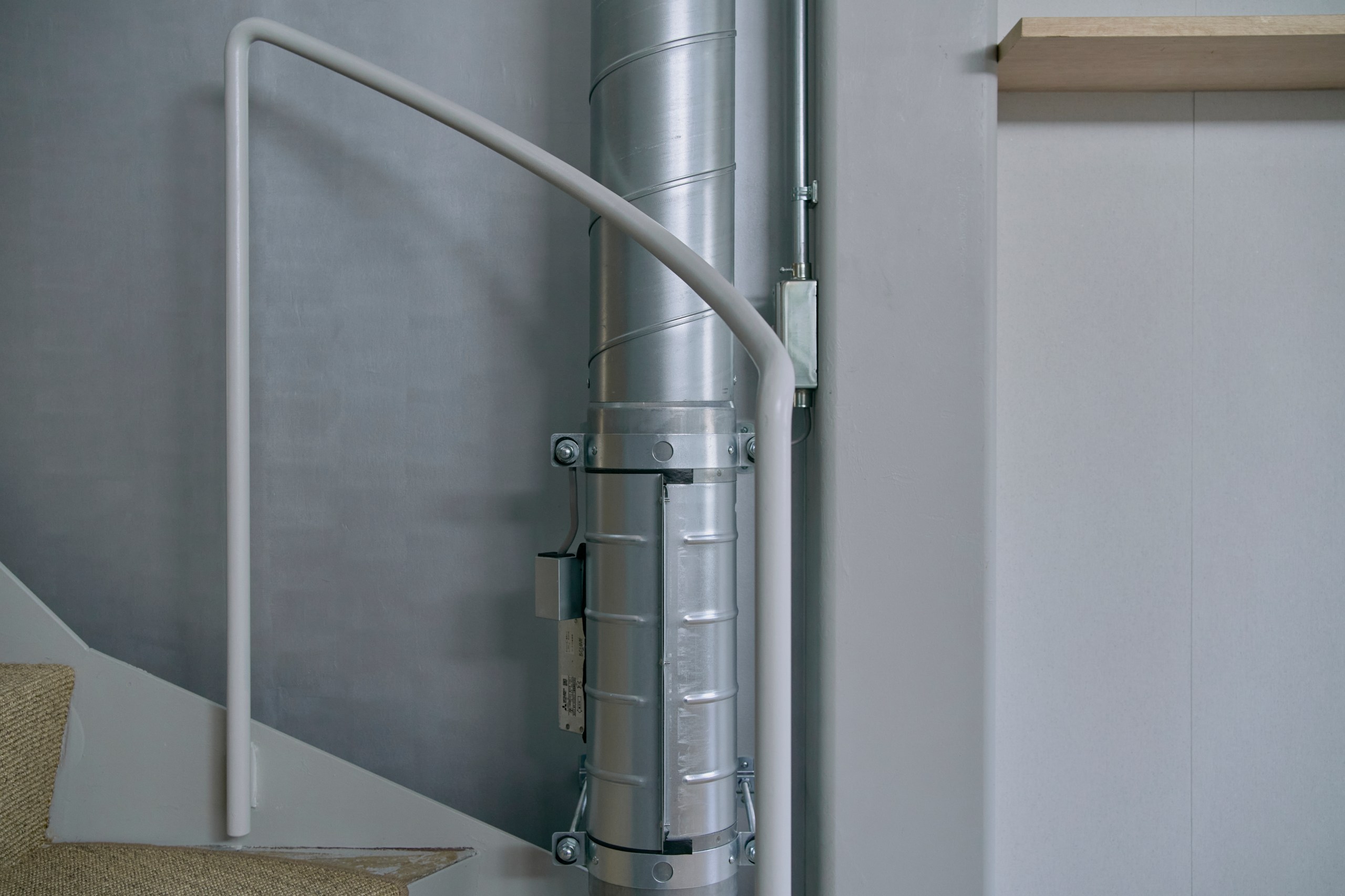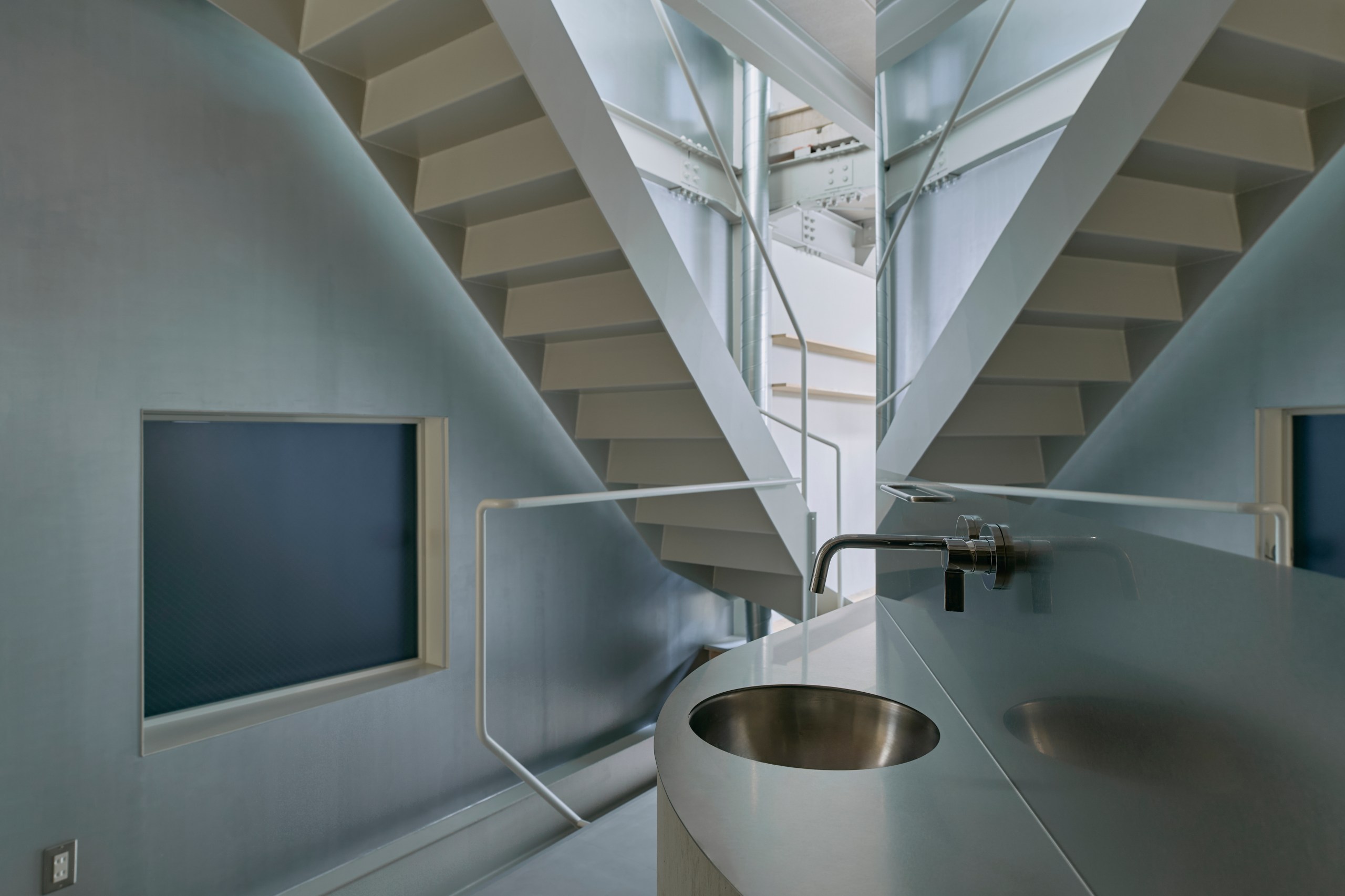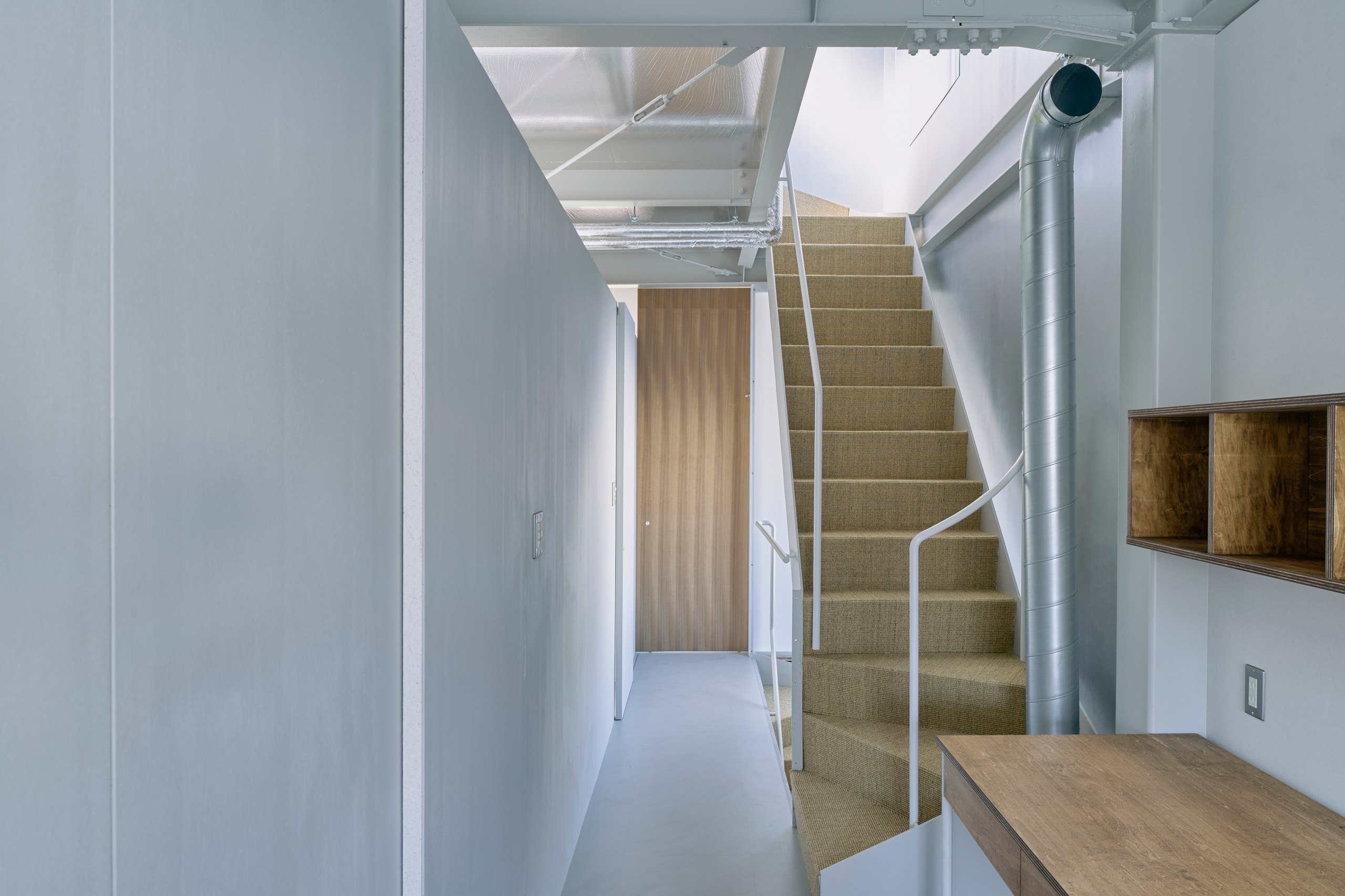 また階段室の最上部に設けた換気扇により夏期は排熱、階段室を貫くダクトファンにより冬期は上部に溜まった熱を下階に循環、最小限の動力で温熱環境を向上、かつての通り庭的な風の流れを立体的に実現している。