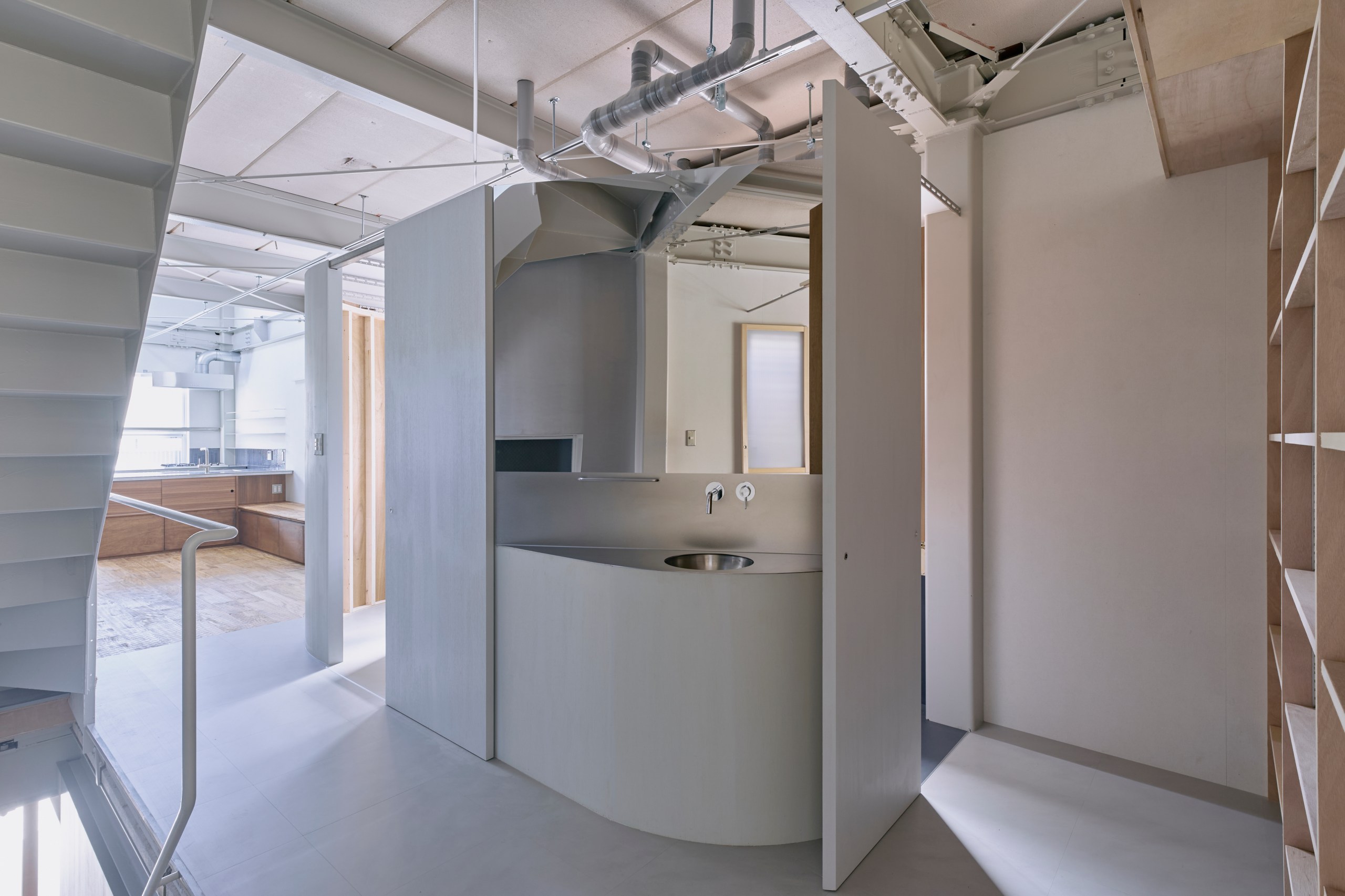 敷地は南側が通りに面し、残りの3方は隣地が迫る典型的なうなぎの寝床であることから、南北に居室を、中央に階段と水回りを配したプランは、碁盤の目の都市計画から必然であり、この構成はインフラ的なものと捉えた。一方でインフィルは上下階のつながりを加え、かつての通り庭が動線だけでなく光や風を通していたことを、継承し立体的に発展させた。