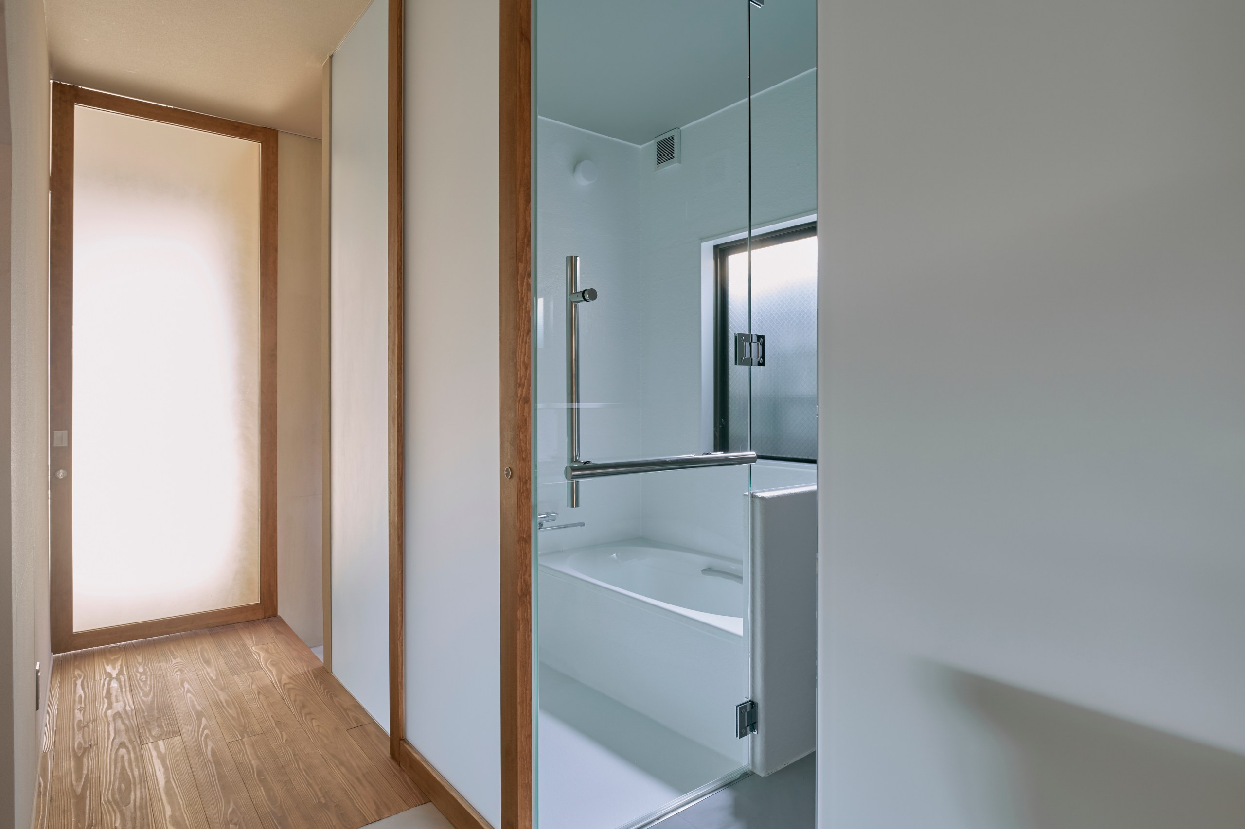 改修前は中央の階段室と廊下、水回りは間仕切りで隔てられ暗い印象であったため、階段室と廊下の間仕切りは取り払い、また水回りは最小限の天井高としALCスラブとの間に隙間を設けて、塔屋から降り注ぐ自然光が中央コアだけでなく南北の居室まで行き渡るようにした。