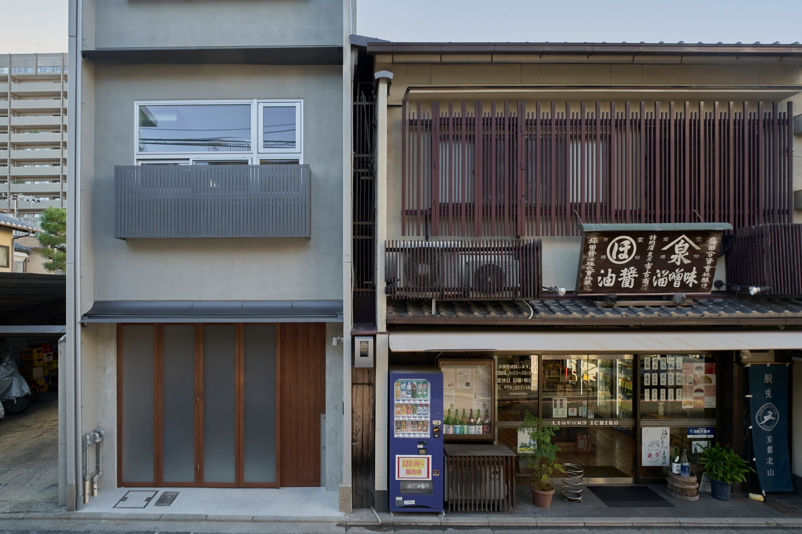 ファサードは既存の急勾配の瓦庇を撤去し隣の町家と高さを揃えた